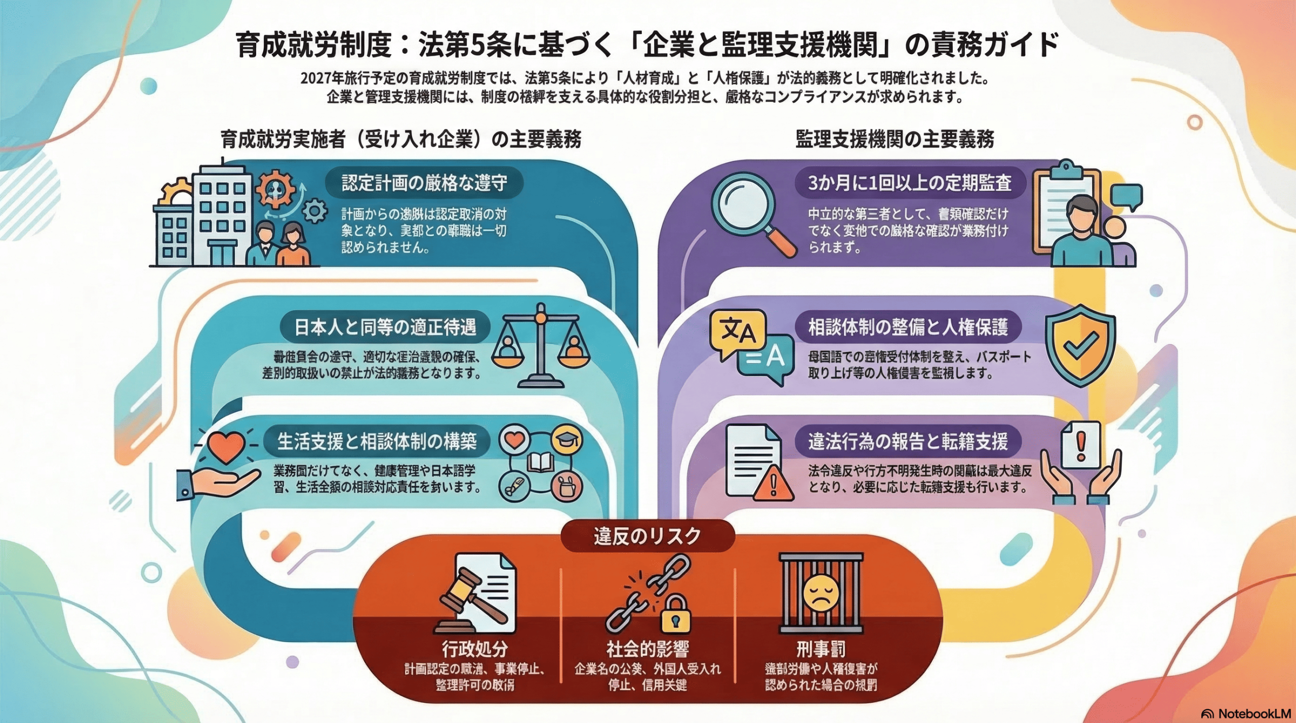2027年施行予定の育成就労制度は、従来の技能実習制度の課題を踏まえ、「人材育成」と「人材確保」を両立させる新たな制度です。その中でも極めて重要なのが、**育成就労実施者および監理支援機関の責務(法第5条)**です。